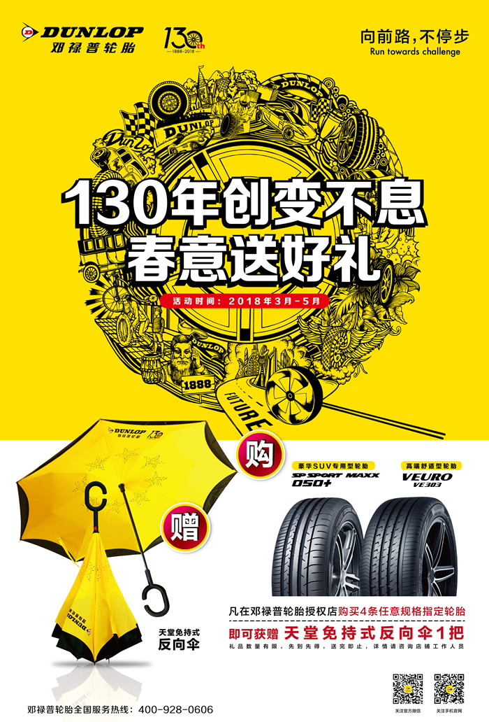 值此130周年慶典之際,為了回饋廣大車主對(duì)鄧祿普的厚愛(ài)與支持,鄧祿普將在全國(guó)范圍內(nèi)推出“春意送好禮”促銷活動(dòng):2018年3月至5月,消費(fèi)者前往鄧祿普指定門店購(gòu)買4條SP SPORT MAXX 050+或VEURO VE303輪胎,即可獲贈(zèng)印有紀(jì)念LOGO的定制版天堂免持式反向傘,無(wú)論風(fēng)雨,鄧祿普都將與車主一路相伴。